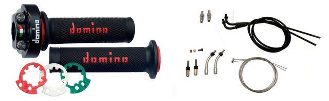 Detalles del productoPuños rapidos Domino para moto. Incluye 2 puños Domino con logo rojo, juego de cables de acelerador y tornilleria.