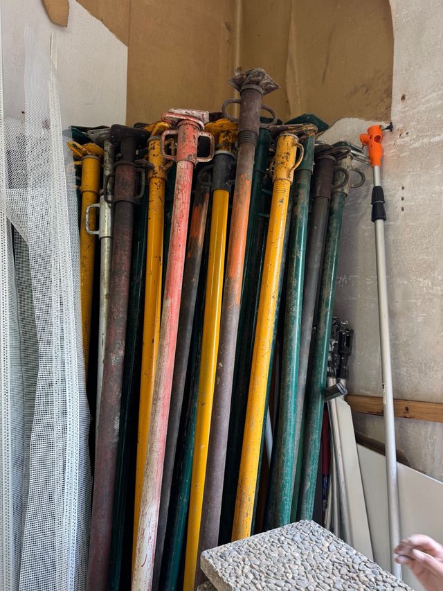Conjunto de puntales metálicos para construcción. Son robustos y de diferentes colores. - Material: Metal. - Colores: Amarillo, rojo, verde y marrón.