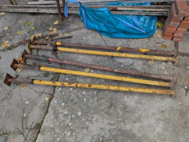 Detalles del productoConjunto de puntales metálicos, utilizados para soporte en construcciones. Presentan un acabado desgastado por el uso.
