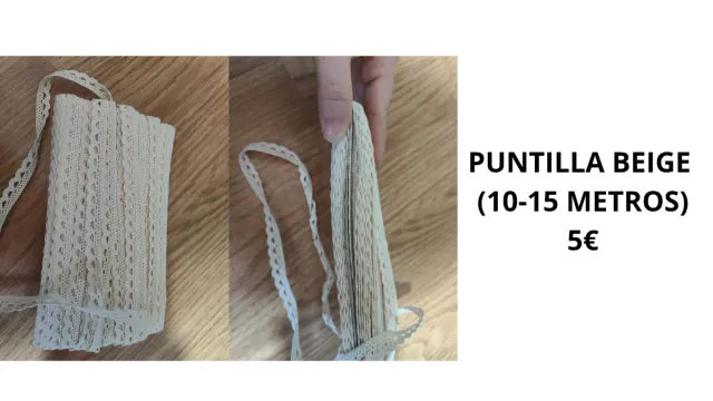 Rollo de puntilla beige, ideal para manualidades y costura. - Longitud aproximada: 10-15 metros. - Color: Beige. - Diseño delicado y ornamental.