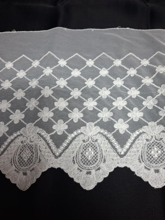 Bonita puntilla de encaje en color blanco, ideal para adornar prendas o proyectos de manualidades. - Ancho de 22 cm. - Diseño floral El precio es x metro. Cuanta necesitas??