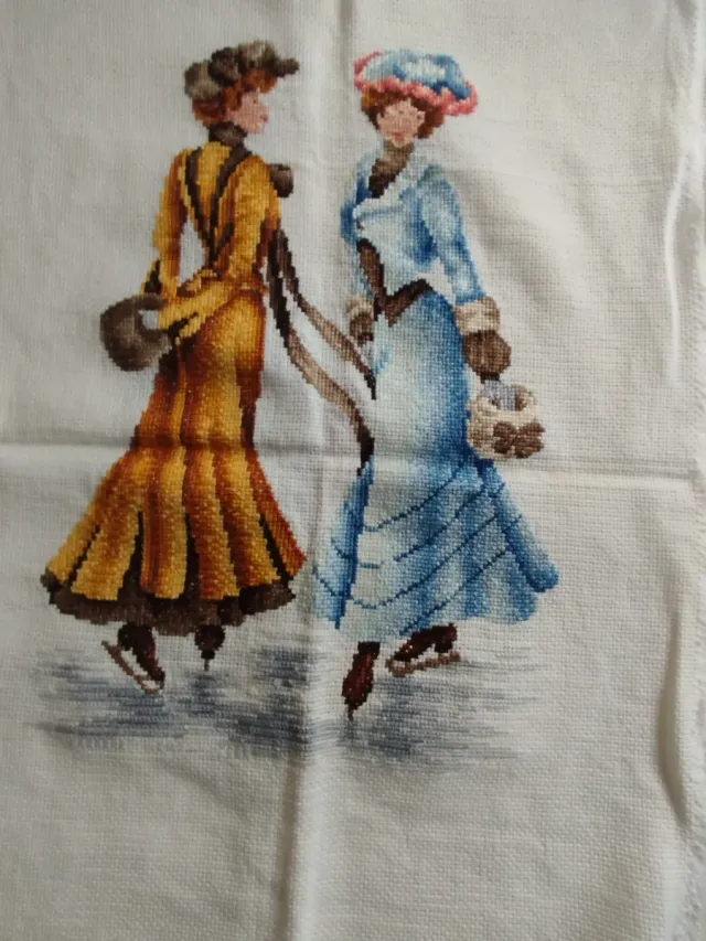 Detalles del productoPrecioso bordado a punto de cruz que representa a dos mujeres con atuendos de época patinando sobre hielo.