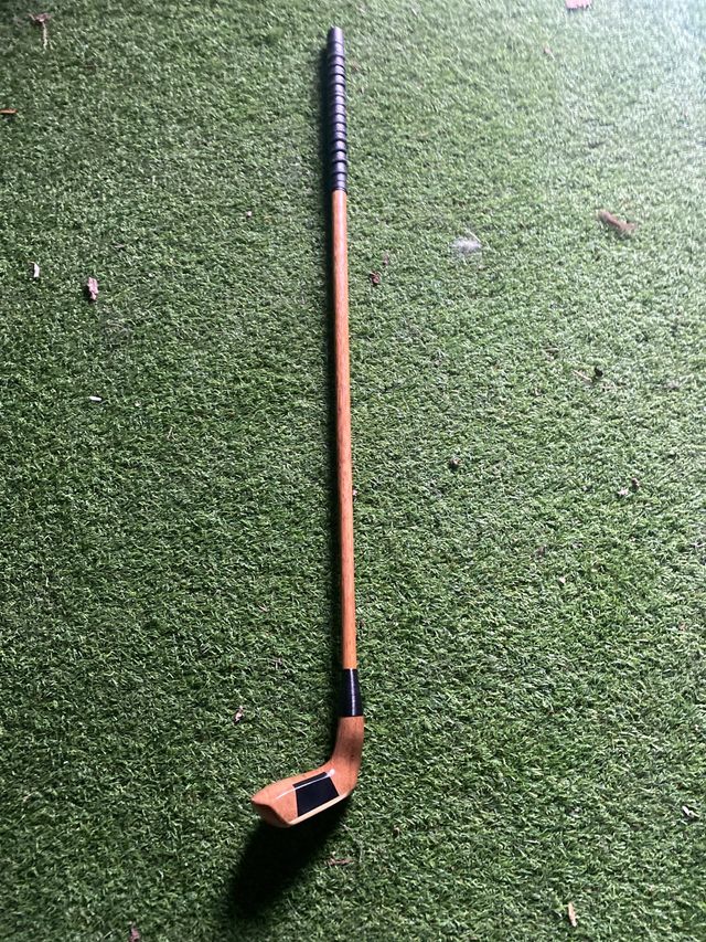 Detalles del productoPutter de golf vintage con varilla de madera de nogal y cabeza de madera.