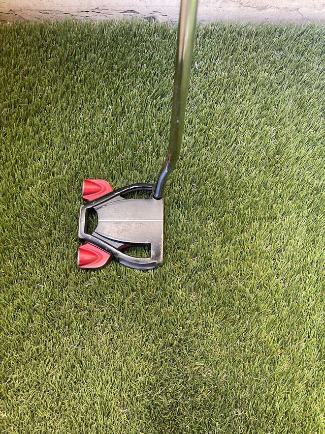 Putter de golf TaylorMade Spider con un diseño moderno y llamativo. - Color principal plateado. - Detalles en rojo. - Varilla metálica.