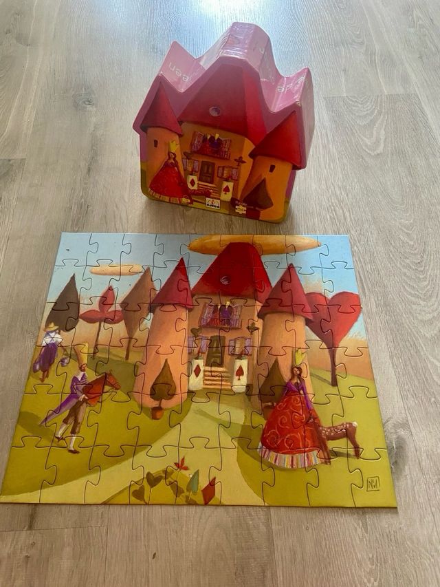 puzzle tamaño grande para montar el suelo marca Djeco castillo con colores vivos.. con caja original en forma de castillo. costo 18€.
