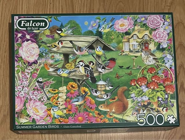 Detalles del productoPuzzle de 500 piezas de la marca Falcon de luxe, titulado Summer Garden Birds por Claire Comerford. Representa una escena colorida de pájaros en un jardín con flores y una casa.