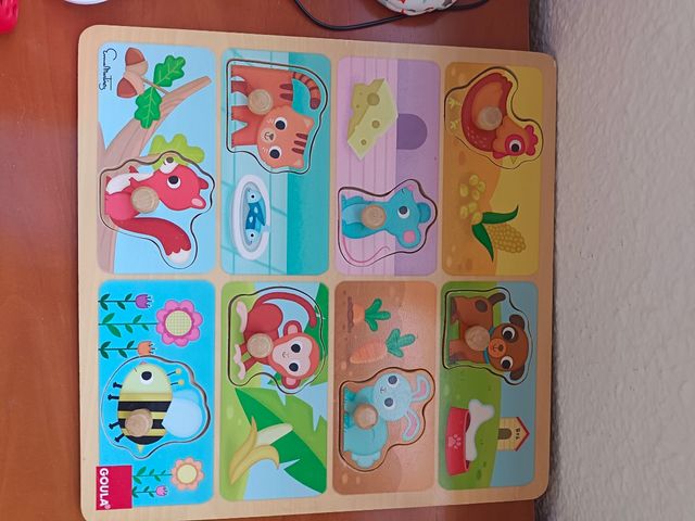 Detalles del productoPuzzle de madera de la marca Goula con temática de animales y comida.