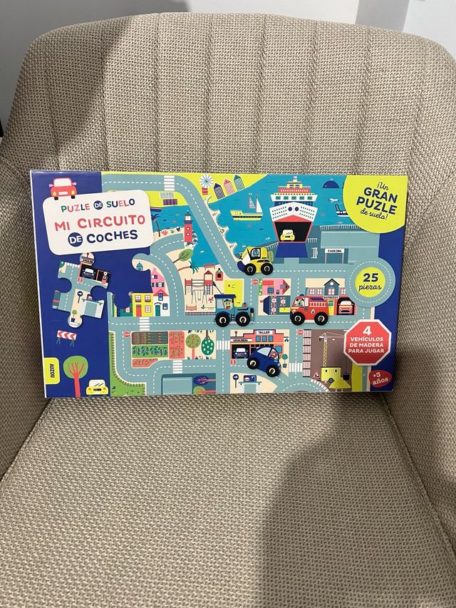 Detalles del productoDivertido puzzle de suelo para crear un circuito de coches. Incluye coches de madera.