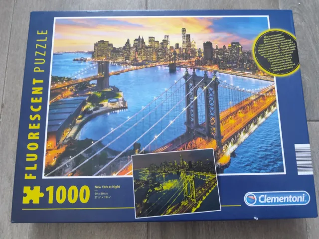 Puzzle Clementoni de 1000 piezas con la imagen New York at Night. - Tamaño del puzzle montado: 69 x 50 cm. - Efecto fluorescente.