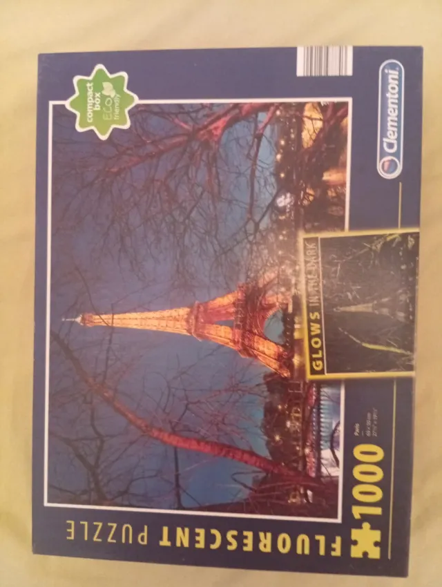 Detalles del productoPuzzle de 1000 piezas de la marca Clementoni con la imagen de la Torre Eiffel iluminada por la noche. Este puzzle tiene la particularidad de que brilla en la oscuridad.