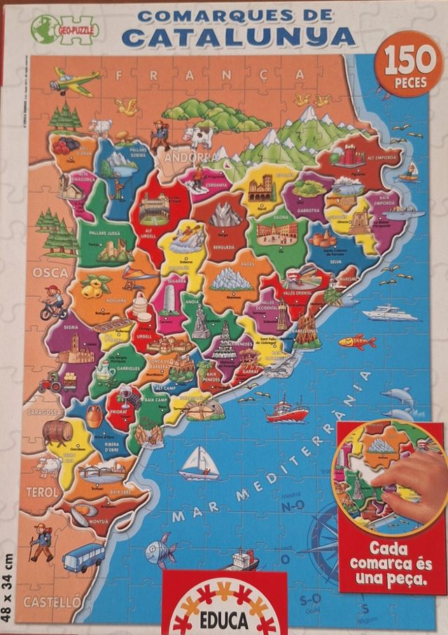 Puzzle educativo de las comarcas de Catalunya. - 150 piezas. - Ilustraciones detalladas de cada comarca. - Incluye mapa de las comarcas de Catalunya.