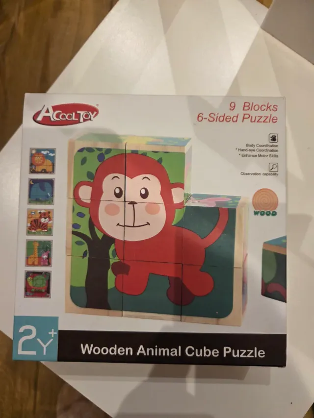 Detalles del productoPuzzle de cubos de madera con temática de animales. Incluye 9 bloques para crear diferentes imágenes.