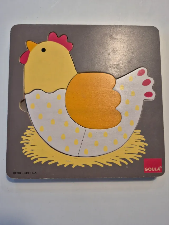 Detalles del productoPuzzle de madera con forma de gallina en su nido, ideal para los más pequeños. Piezas de colores vivos y diseño atractivo.