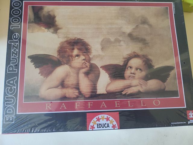 Detalles del productoPuzzle de 1000 piezas de la marca Educa, sin abrir. Representa una pintura de Rafael con dos ángeles. - Nuevo y sellado. - Medidas: 68 x 48 cm. - Perfecto para amantes del arte y los puzzles.