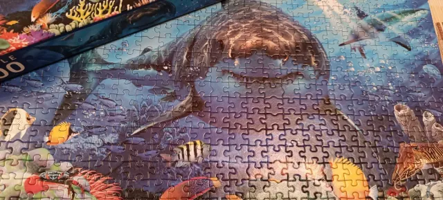 Puzzle de la marca Educa con una imagen de un tiburón y vida marina. - 500 piezas. - Imagen submarina con peces y corales. Está completo, con todas las piezas.