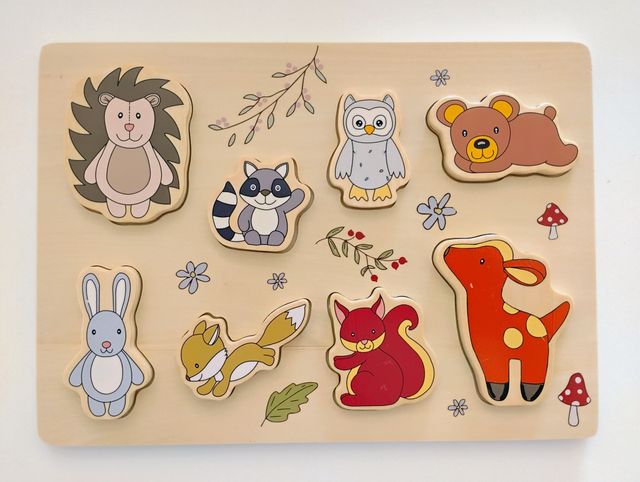 Detalles del productoPuzzle de madera con animales del bosque encajables. Para niños a partir de 2 años. Incluye 8 piezas: erizo, mapache, búho, oso, conejo, zorro, ardilla y ciervo. Estimula la motricidad fina y el pensamineto lógico. Juguete testado. De la marca Playtive. Como nuevo. Se entrega limpio y desinfectado y, si se quiere, en su caja original.