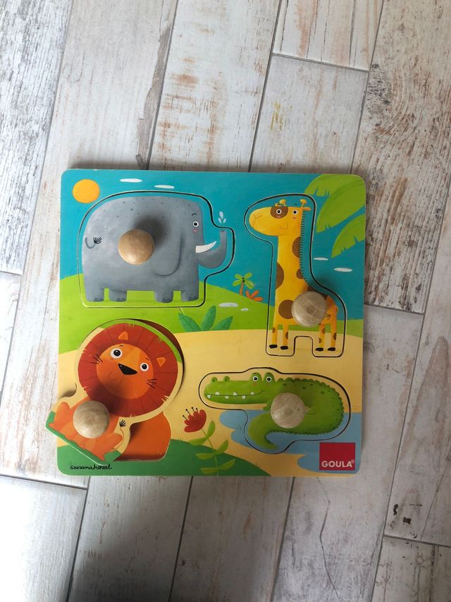 Detalles del productoPuzzle de madera con simpáticos animales de la selva, ideal para los más pequeños. Diseñado por Goula.