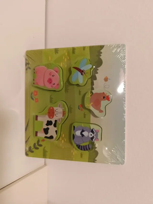 Detalles del productoPuzzle de madera con temática de animales de granja, ideal para los más pequeños. Las piezas son grandes y fáciles de manipular.