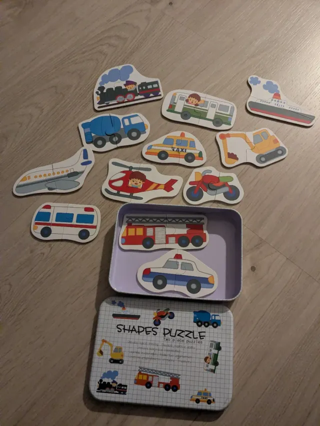 Detalles del productoSet de puzzles de madera con diferentes vehículos.