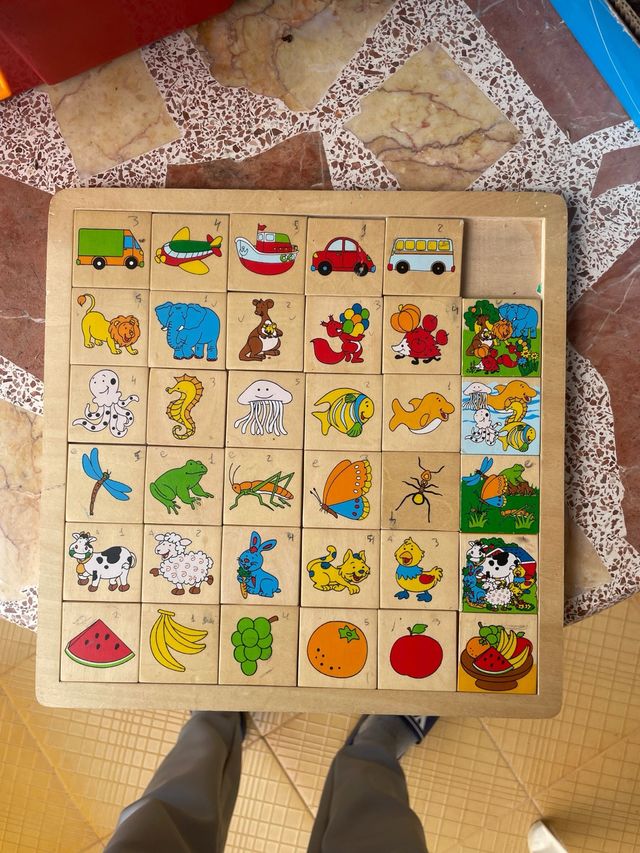 - Incluye 30 fichas con dibujos de animales, vehículos y frutas.