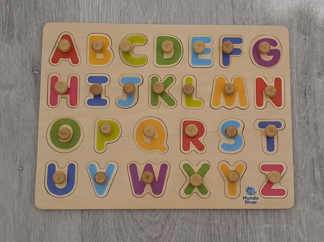 Puzzle de madera infantil de la marca "Mundo Diver" para aprender las mayúsculas. En cada hueco viene un dibujito y su nombre en inglés.
