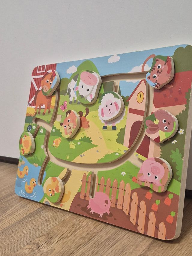 Detalles del productoDivertido puzzle de madera con temática de animales de granja. Ideal para los más pequeños. Diseño Montessori.