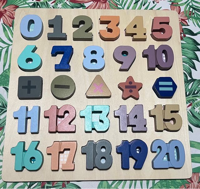Detalles del productoPuzzle educativo de madera con números del 1 al 20 y símbolos de operaciones.