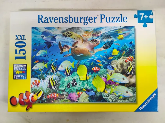Detalles del productoPuzzle de la marca Ravensburger con 150 piezas, tamaño XXL. La imagen muestra un vibrante mundo submarino con tortugas marinas y peces de colores.