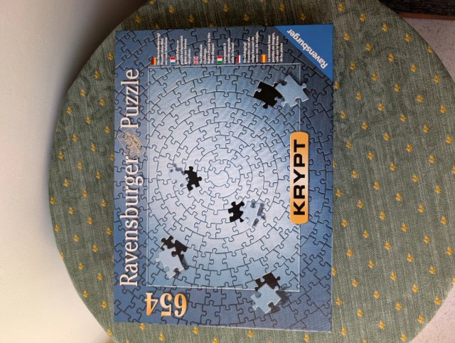 Puzzle Ravensburger Krypt con 654 piezas. Este puzzle está diseñado para ser completado basándose únicamente en la forma de las piezas, sin necesidad de una imagen de referencia. Queda bonito el diseño que dejan las formas de las piezas.