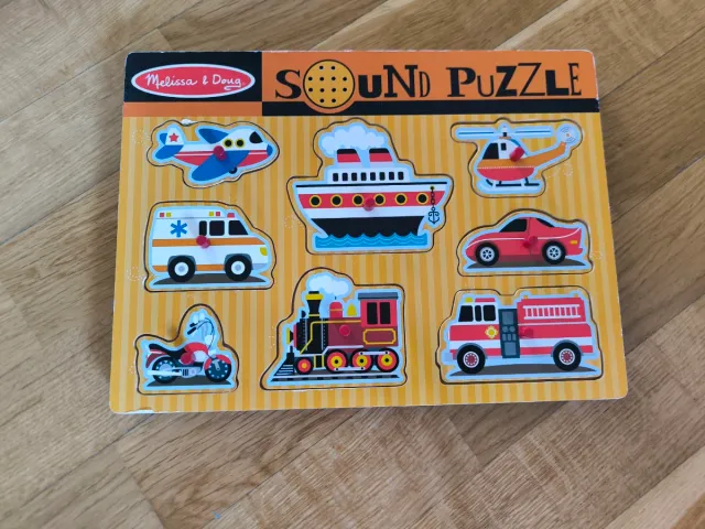 Puzzle infantil de madera con temática de vehículos y sonidos. - Incluye 8 piezas de vehículos. - Diseño de rayas amarillas. - Marca: Melissa & Doug.