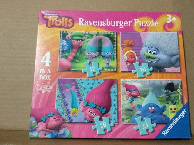 Puzzle Trolls 4 en 1 de la marca Ravensburger. De 12, 16, 20 y 24 piezas. Recomendado para mayores de 3 años. Muy poco uso.