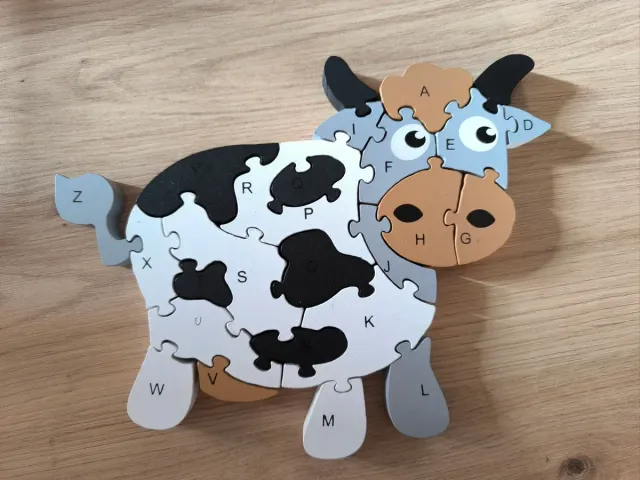 Detalles del productoDivertido puzzle de madera con forma de vaca. Las piezas están decoradas con letras y números para aprender jugando.