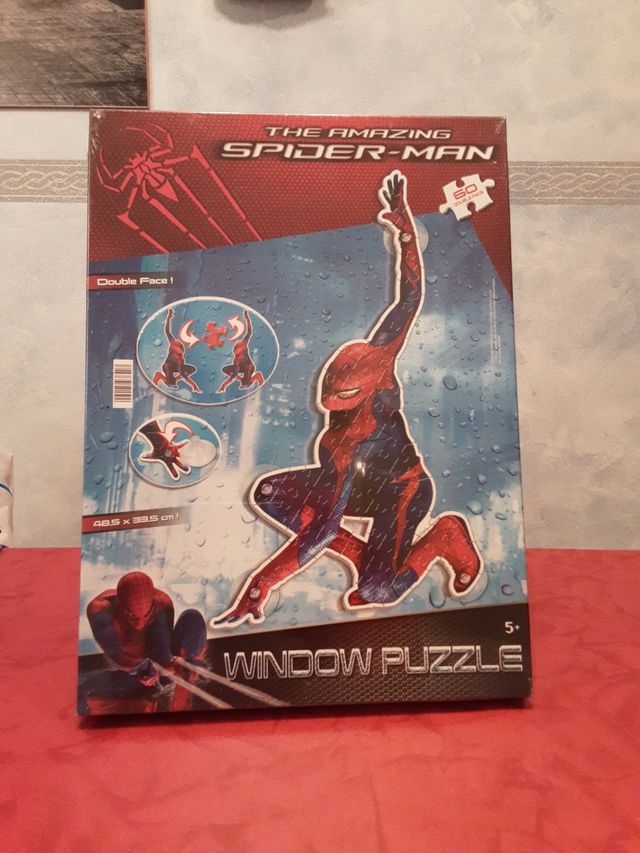 Detalles del productoSe vende puzzle del hombre araña de doble cara, precintado, sin abrir ni usar, montado mide 48x35 cm, se incluye pegamento y ventosas para colgar en la ventana y verlo desde afuera y adentro, perfecto regalo para Navidad y cumpleaños, se hacen envios Medidas del producto
