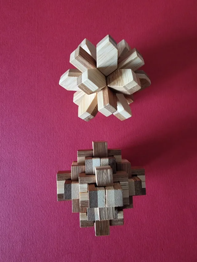 Dos rompecabezas de madera con diseños geométricos. - Fabricados en madera de bambú. - Uno tiene forma de estrella y el otro es cúbico.
