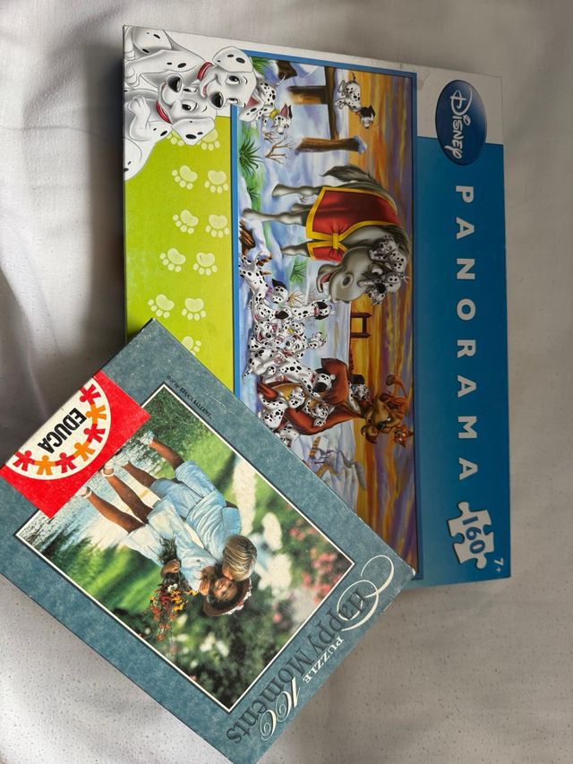 Dos puzzles para horas de diversión. - Puzzle Panorama Disney 101 Dálmatas, 160 piezas. - Puzzle Educa Happy Moments, 100 piezas.