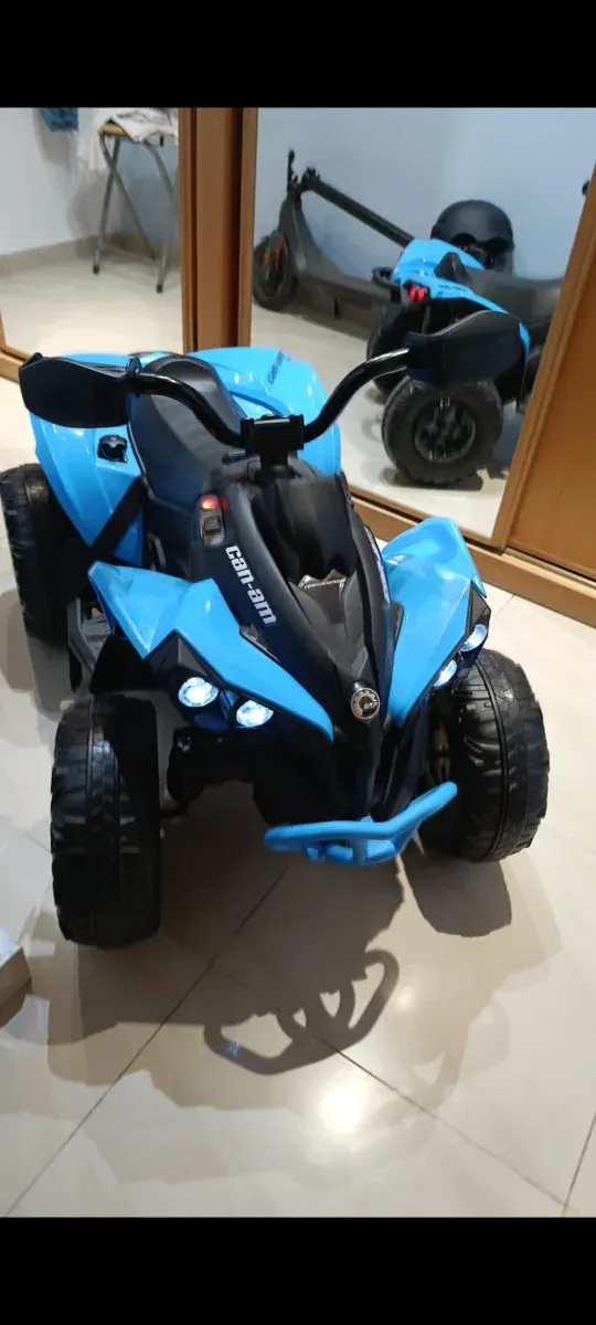 Quad infantil de Can-Am en color azul y negro. Diseño deportivo y llamativo. - Ruedas todoterreno. - Luces delanteras. - Volante ergonómico.