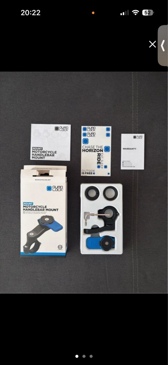 Detalles del productoSoporte Quad Lock para manillar de motocicleta. Incluye todo lo necesario para su instalación.