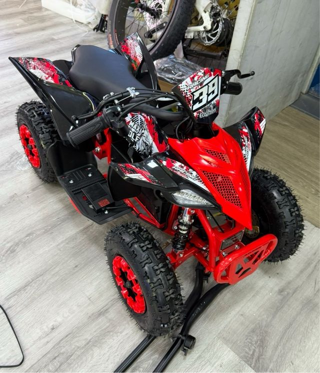 Detalles del productoMini Quad electrico para niños y niñas. El quad es ideal para los más pequeños de la casa. Frenos de disco delanteros y traseros. Peso del quad: 49 kg. Bateria de 36v y 12Ah. Incluye 2 llaves. Con 3 velocidades. Velocidad máxima 25 km/h. Peso máximo soportado: 70 kg. Indicador led de la batería. Autonomía: de 25 a 35 Km. Suspensión delantera y trasera. Luces led delanteras. Carga: 4-6 horas. En color Rojo y Negro. Con marcha adelante y atrás. Medidas: 1mt de largo, 55cm de ancho, 60cm de alto. Para niños de 4-5 años en adelante. Con garantía. Quad nuevo a estrenar en su caja original. Hacemos envios fuera de wallapop
