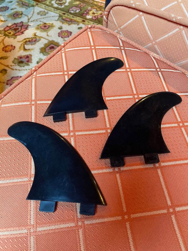 Set de tres quillas negras para tabla de surf. Venían con una Zeus Fuego 7”. Tienen 5 baños contados.