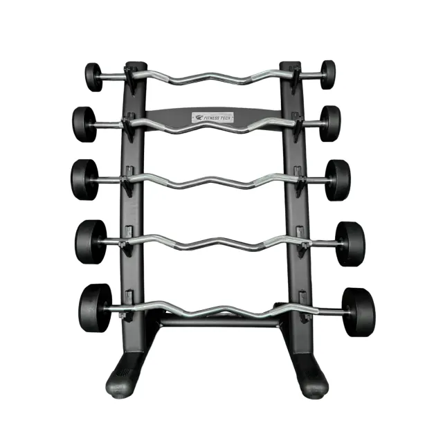 El set de barras montadas curvas con rack de Fitness Tech ofrece una solución completa para el entrenamiento de fuerza y tonificación muscular. Incluye 5 barras pre-montadas (10, 15, 20, 25 y 30 kg) y un rack de almacenamiento resistente, ideal para gimnasios, centros de cross-training o rehabilitación.