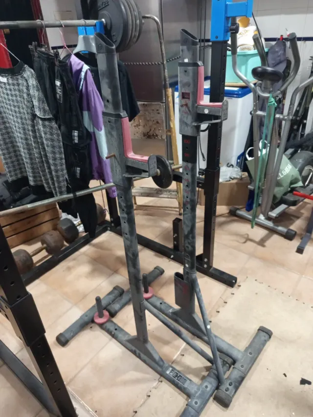 Rack de gimnasio para entrenamiento de fuerza. - Estructura metálica robusta. - Barras de seguridad ajustables. - Soporte para discos.