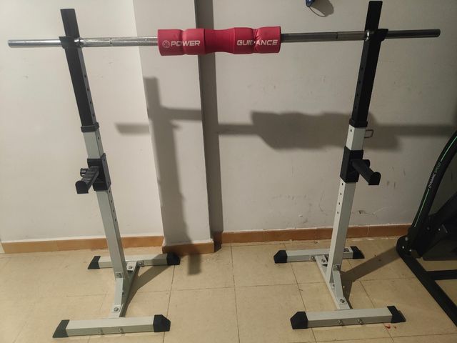 Rack de pesas para entrenamiento en casa. Es robusto y fácil de ajustar. - Estructura metálica. - Barras de soporte acolchadas.