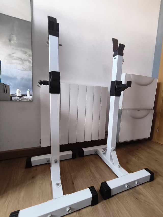Detalles del productoRack de pesas blanco, ideal para entrenamientos en casa. Su diseño es robusto y funcional.