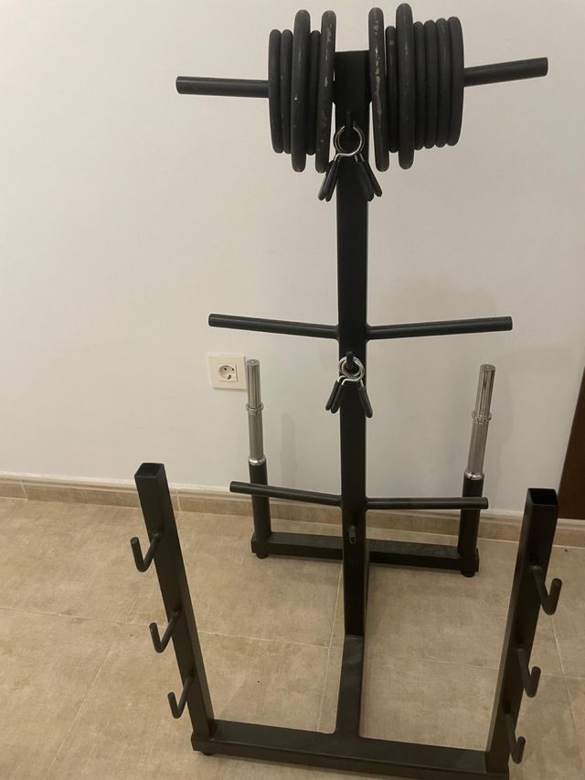 Equipo de gimnasio para entrenar en casa. - Rack de acero negro. - Incluye barra y discos de pesas.