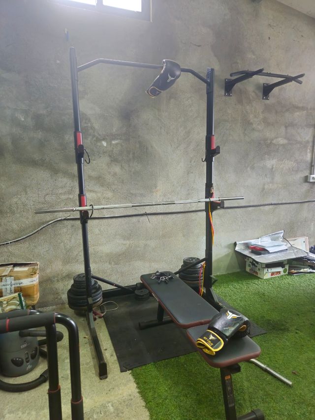 Detalles del productoSe vende rack de gimnasio multifuncional en buen estado. Incluye barra y pesas.