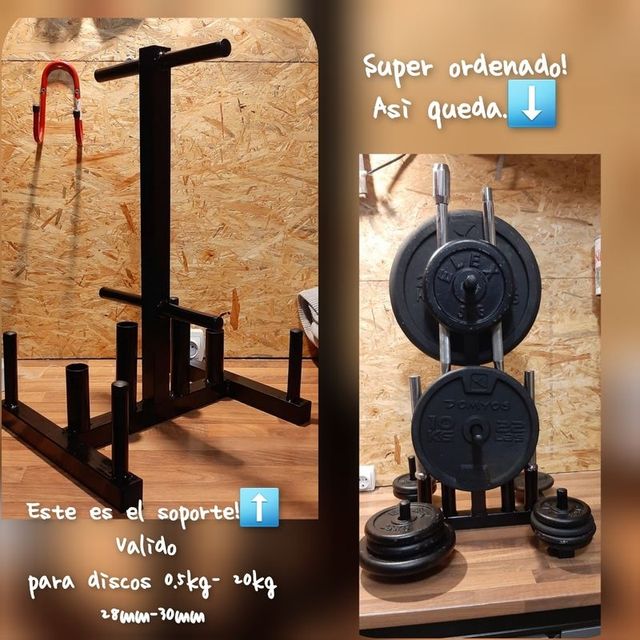 Detalles del productoSoporte de pesas para discos de pesas de 28 y 30 mm, barras, y mancuernas.