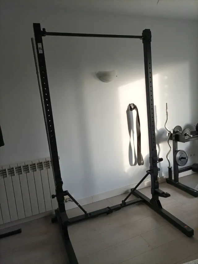 Detalles del productoRack plegable para entrenamientos de fuerza en casa. Su diseño permite guardarlo fácilmente cuando no está en uso.