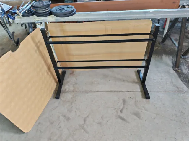 Detalles del productoSoporte metálico negro para organizar pesas.