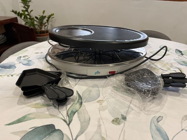 Detalles del productoAparato eléctrico para preparar raclette y crepes. Incluye la plancha superior y las pequeñas sartenes.