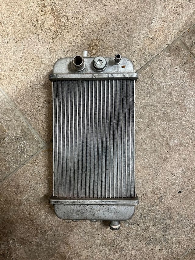 Radiador de refrigeración para moto Derbi. - Pieza metálica plateada. - Hace falta una reparación en la parte baja del radiador. Por lo demás está perfecto